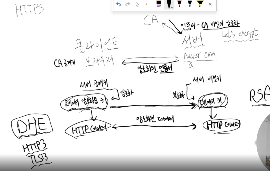 7) 각각 Browser와 naver Server는 HTTP data를 주고받을 때 가지고 있는 키로 암호화와 복호화를 해서보냄.
